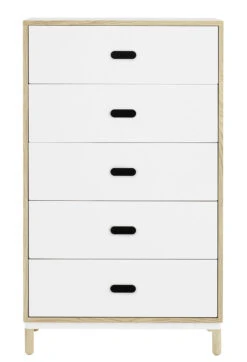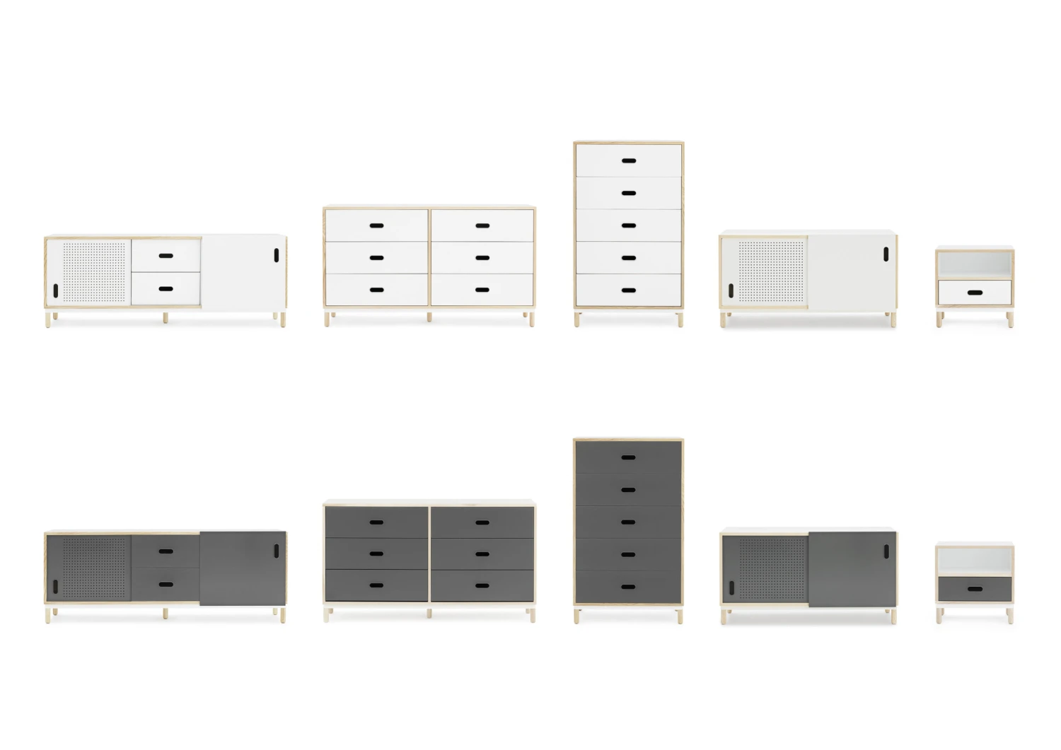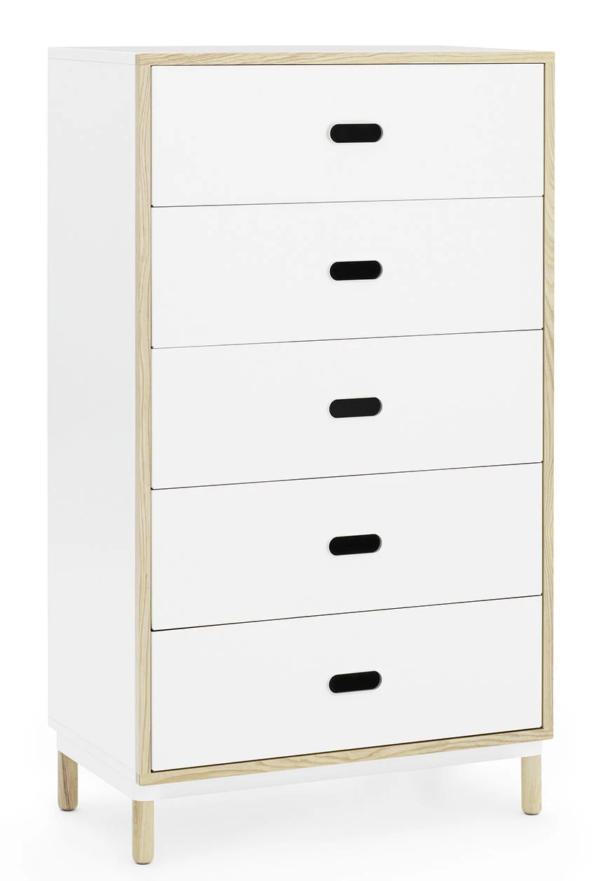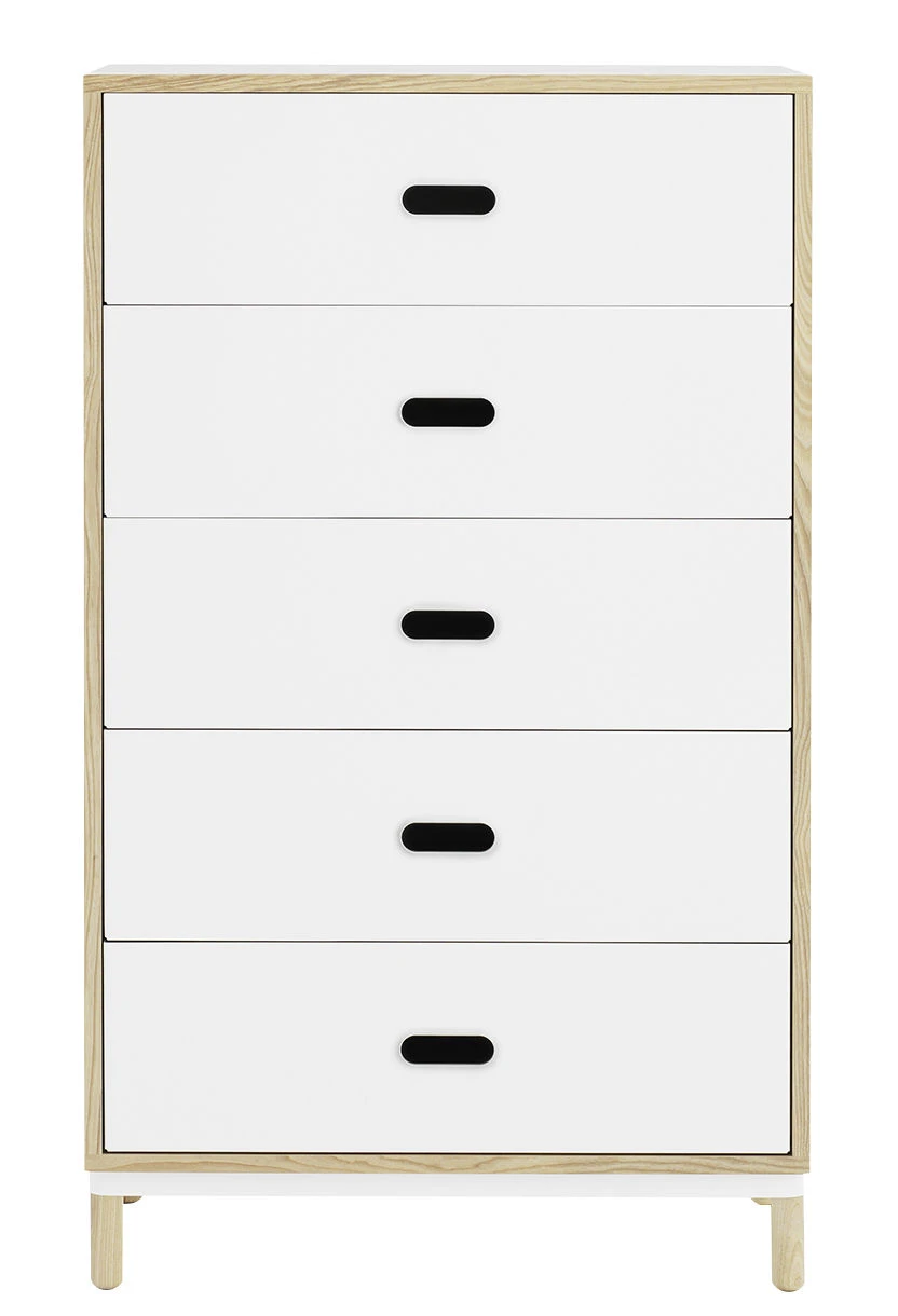 „Kabino“ hat er mit Grifflöchern ausgestattet, die perfekt in die Schubladenfronten integriert sind. Der Korpus aus hellem Eschenholz und die runden Füße verstärken den modernen, grafisch anmutenden Look der Metall-Schubladen, die für komfortable Handhabung mit einer Soft-Close-Automatik versehen sind.