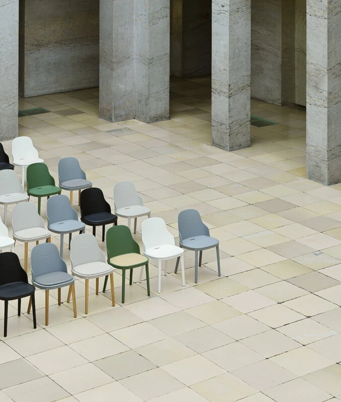 Das Gestell des Allez-Stuhls besteht aus leichtem, aber extrem haltbarem Polypropylen und ist in verschiedenen Sitzvarianten erhältlich. Die Sitzfläche des Stuhls besteht aus geformtem Kunststoffgeflecht. Die Materialien wurden so gewählt, dass der Stuhl auch im Freien auf der Terrasse oder im Garten eingesetzt werden kann. Dank der leichten Materialien wiegt der Stuhl nur 3,6 kg und lässt sich leicht verschieben, zum Beispiel vom Balkon zum Esstisch. Neben privaten Wohnräumen kann man sich den Allez-Stuhl auch gut in verschiedenen öffentlichen Bereichen vorstellen, wie zum Beispiel in den Bistros, die ihm als Inspiration dienten.