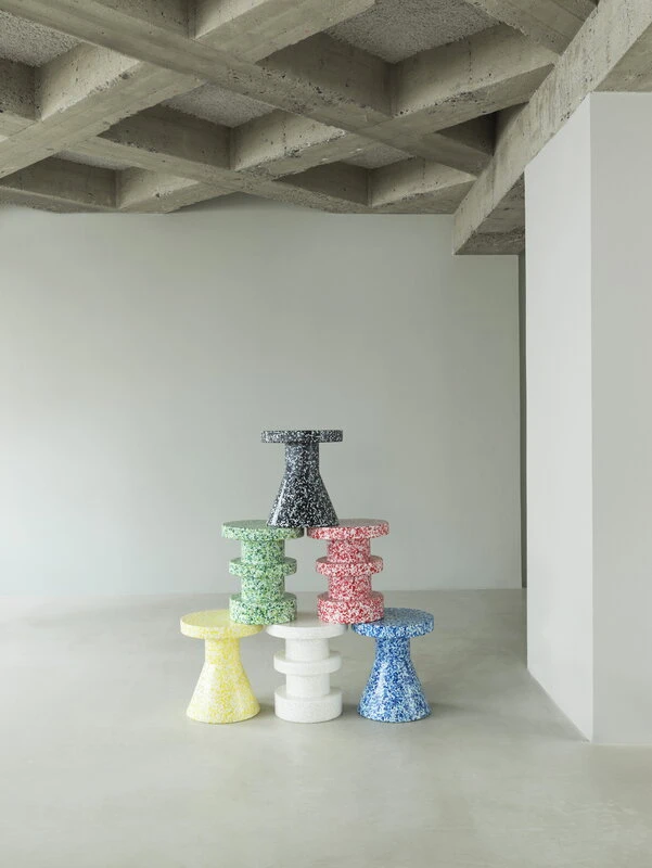 Der Bit-Hocker von Normann Copenhagen ist ein herrlich individuelles, vielseitiges Möbelstück, das als Sitzgelegenheit, Beistelltisch und Ständer für Blumen und Grünpflanzen dient. Der von Simon Legald entworfene Hocker besteht aus recyceltem Kunststoff. Seine monolithische Form wird durch eine gepunktete Oberfläche belebt, die vom Material herrührt: Während des Herstellungsprozesses des Hockers setzen sich geschmolzene, bunte Kunststoffteile in jedem Hocker auf etwas andere Weise ab. Deshalb ist jeder Hocker ein Unikat.