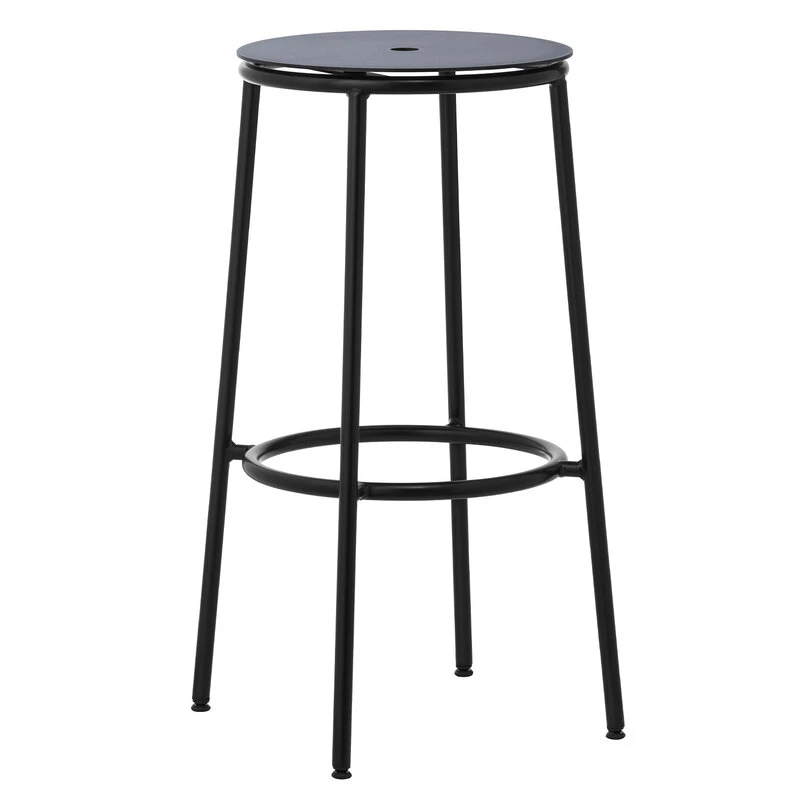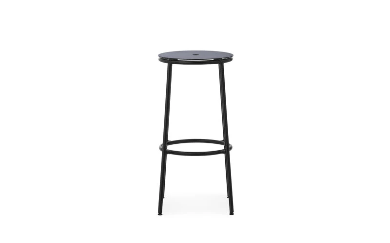 Der Circa-Hocker von Normann Copenhagen ist ein minimalistischer und zeitloser Barhocker mit einem Rahmen aus schlankem Stahlrohr und einer Sitzfläche aus schwarz lackiertem Aluminium. Der von Simon Legald entworfene Hocker verdankt seinen Namen seinen runden Elementen: die Kreisform wird in der Sitzfläche, der runden Fußstütze sowie im Loch in der Mitte der Sitzfläche wiederholt, durch das der Hocker sich leicht von einem Ort zum nächsten tragen lässt. Der klassische und doch zeitgemäße Circa-Barhocker passt perfekt an jede Kücheninsel, an den Esstisch und eignet sich auch als zusätzlicher Stuhl für Überraschungsgäste.