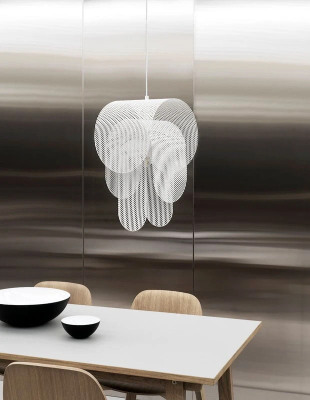 La lampada a sospensione Superpose di Normann Copenhagen è come un moderno lampadario che ricorda una cascata o una fontana. La lampada, disegnata da Frederik Kurzweg, consiste in tre lastre di metallo piegate che pendono l’una sotto all’altra, dalla più grande alla più piccola. La forma arrotondata e arcuata e la superficie perforata delle lastre di metallo donano alla lampada a sospensione un carattere arioso e giocoso – la forma scultorea cambia a secondo della direzione dalla quale la si guarda.