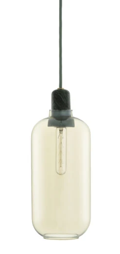 Mit einer wunderbaren Synthese verschiedener edler Materialien lässt die Hängelampe „Amp“ einen tollen Mix aus Retro-Charme und moderner Schlichtheit entstehen. Die Lampe besteht aus einem zarten Lampenschirm aus farbigem Glas, der an einer Fassung aus echtem Marmor aufgehängt ist. Die Zartheit des Lampenschirms, der leicht wie eine Seifenblase daherkommt, bildet einen tollen Kontrast zum massiven, sinnlichen Look des Marmors. Die verwendeten hochwertigen Materialien und die sorgsam ausgearbeitete Form des Lampenschirms verleihen dieser Hängelampe einen anspruchsvoll-filigranen, zeitlosen Look, der sich in die Reihe der großen Kultobjekte des Designs einreiht. Dank des transparenten Glases kommt die außergewöhnliche Glühbirne im Retro-Look besonders gut zur Geltung. Ihre zahlreichen, straußförmig angeordneten Glühdrähte lassen einen tollen Leuchteffekt entstehen (Glühbirne ist nicht mitgeliefert).