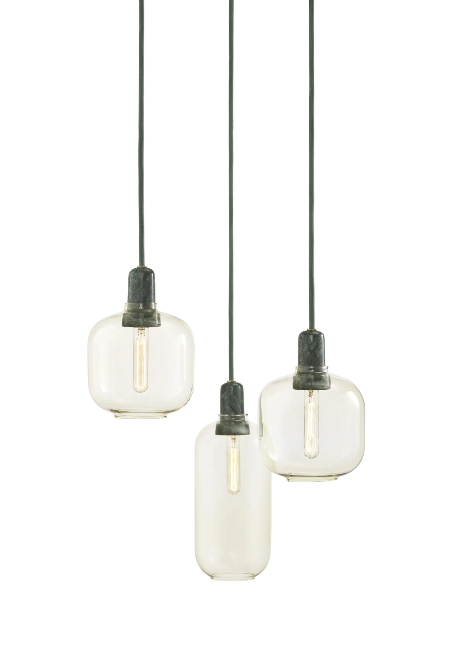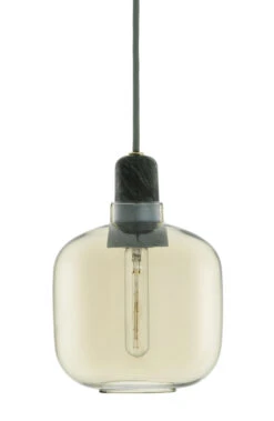 Mit einer wunderbaren Synthese verschiedener edler Materialien lässt die Hängelampe „Amp“ einen tollen Mix aus Retro-Charme und moderner Schlichtheit entstehen. Die Lampe besteht aus einem zarten Lampenschirm aus farbigem Glas, der an einer Fassung aus echtem Marmor aufgehängt ist. Die Zartheit des Lampenschirms, der leicht wie eine Seifenblase daherkommt, bildet einen tollen Kontrast zum massiven, sinnlichen Look des Marmors. Die verwendeten hochwertigen Materialien und die sorgsam ausgearbeitete Form des Lampenschirms verleihen dieser Hängelampe einen anspruchsvoll-filigranen, zeitlosen Look, der sich in die Reihe der großen Kultobjekte des Designs einreiht. Dank des transparenten Glases kommt die außergewöhnliche Glühbirne im Retro-Look besonders gut zur Geltung. Ihre zahlreichen, straußförmig angeordneten Glühdrähte lassen einen tollen Leuchteffekt entstehen (Glühbirne ist nicht mitgeliefert).