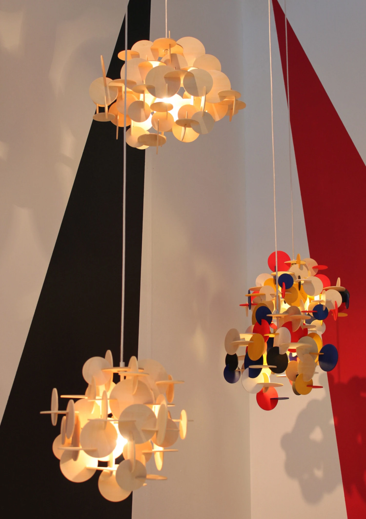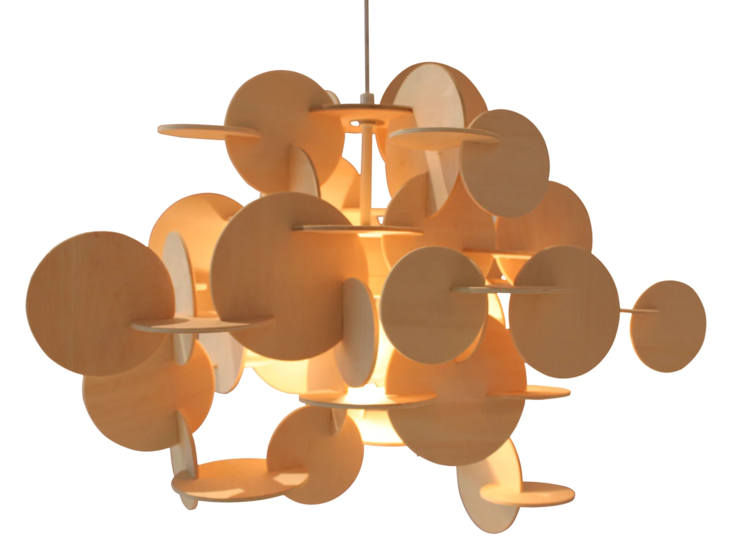 Wie ein 3D-Puzzle wird die Hängelampe „Bau“ als eine Art Baukasten geliefert: sie wird zusammengebaut, indem die Holzscheiben miteinander verbunden werden (Montageanleitung wird mitgeliefert).