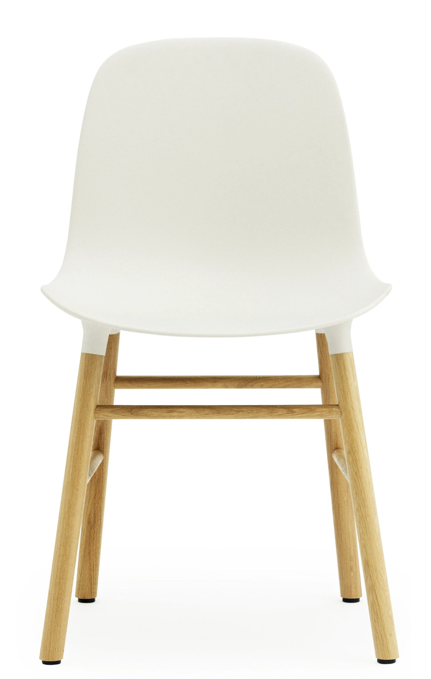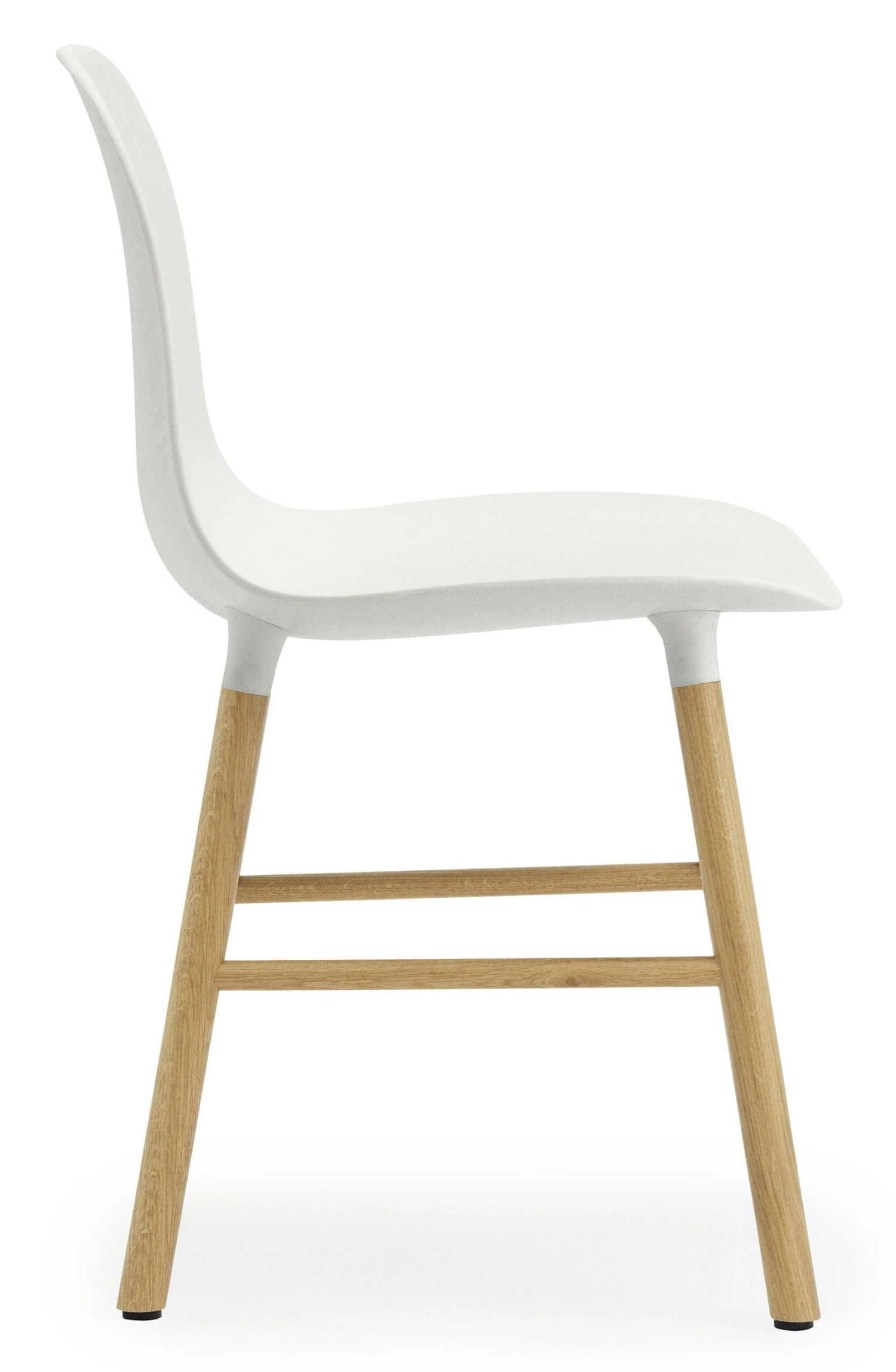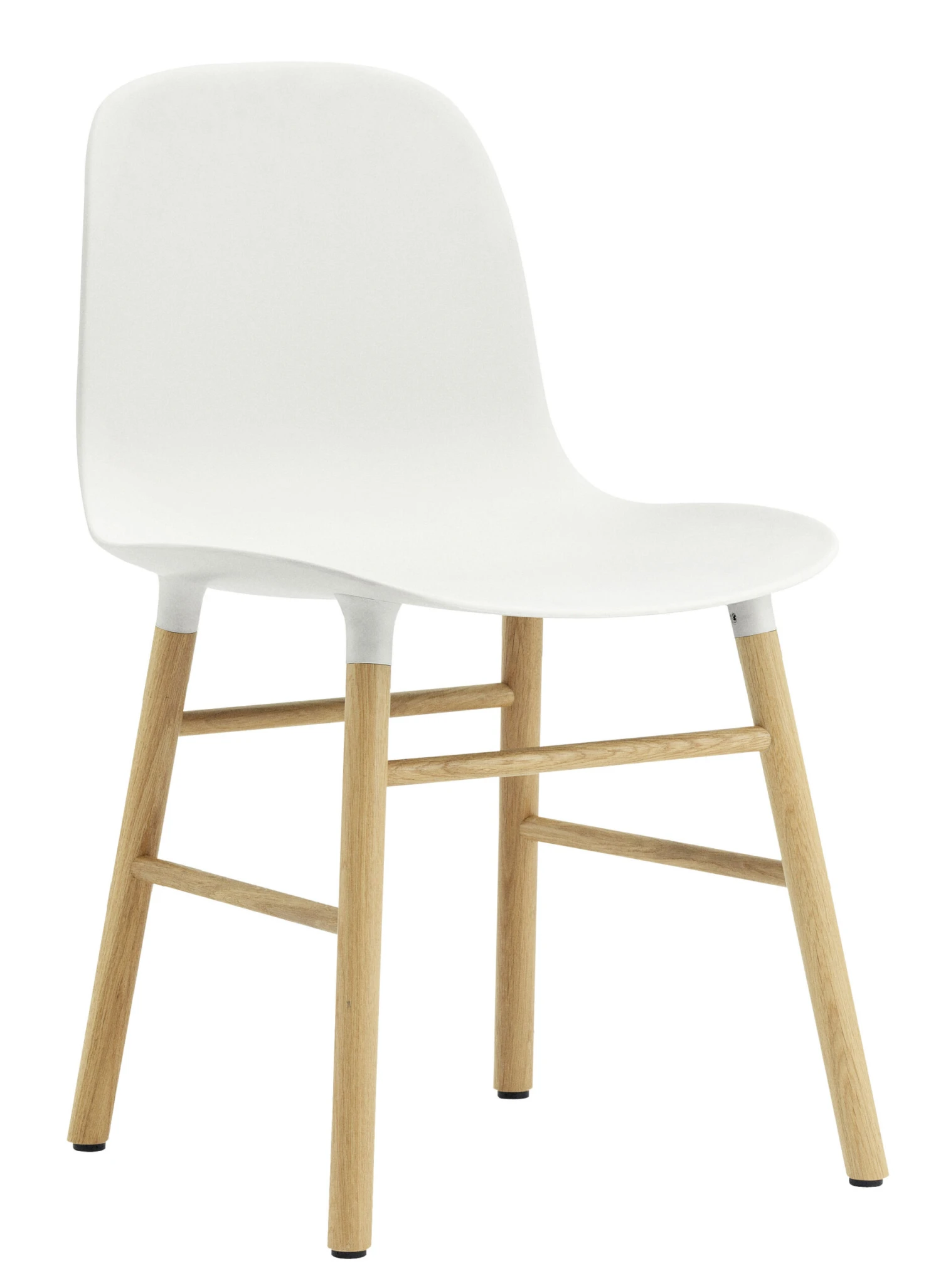 Dieser Stuhl im skandinavischen Look ist eine Kreuzung aus industrieller und handwerklicher Fertigung. „Form“ besteht aus einer breiten Sitzschale aus Polypropylen, die im Spritzgussverfahren gefertigt wurde. Dieser industrielle Prozess wird mit einer manuellen Technik verbunden: Die Stuhlbeine aus massivem Holz werden von Schreinern von Hand gefertigt und dann mit der Sitzschale verbunden. Damit auch die Optik stimmt, sind besonders die Verbindungselemente zwischen Sitzfläche und Stuhlbeinen sorgfältig verarbeitet. Die in die Sitzschale eingesteckten Stuhlbeine bilden eine natürliche Verlängerung der Sitzfläche. Drei Jahre Entwicklungsarbeit waren nötig, um die gegossene Sitzschale zu perfektionieren. Neigungswinkel, Kurven oder wechselnde Dicken: Alles ist bis ins kleinste Detail durchdacht, damit es sich möglichst gut an den Körper anschmiegt und optimalen Sitzkomfort bietet. Während der obere Teil der Rückenlehne dünn und flexibel ist, wird sie nach unten hin immer dicker und sorgt so für Stabilität und perfekten Halt.
